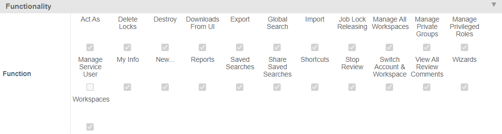 The Functionality section has a list of permissions that control access to global Dalet Flex functionalities, such as workspaces and search, allowing you to control what functions can be carried out by a specific role. You might assign some, if not all these permissions, to an advanced role such as a Systems Administrator so that they have full control over functionality in Dalet Flex.