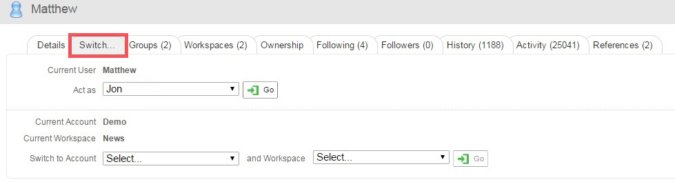 The Switch tab allows you to act as another user and switch between accounts. You can use this function to complete work on someone else’s behalf. For example, If User A acts on behalf of User B, User A will take on all the permissions that belong to User B.