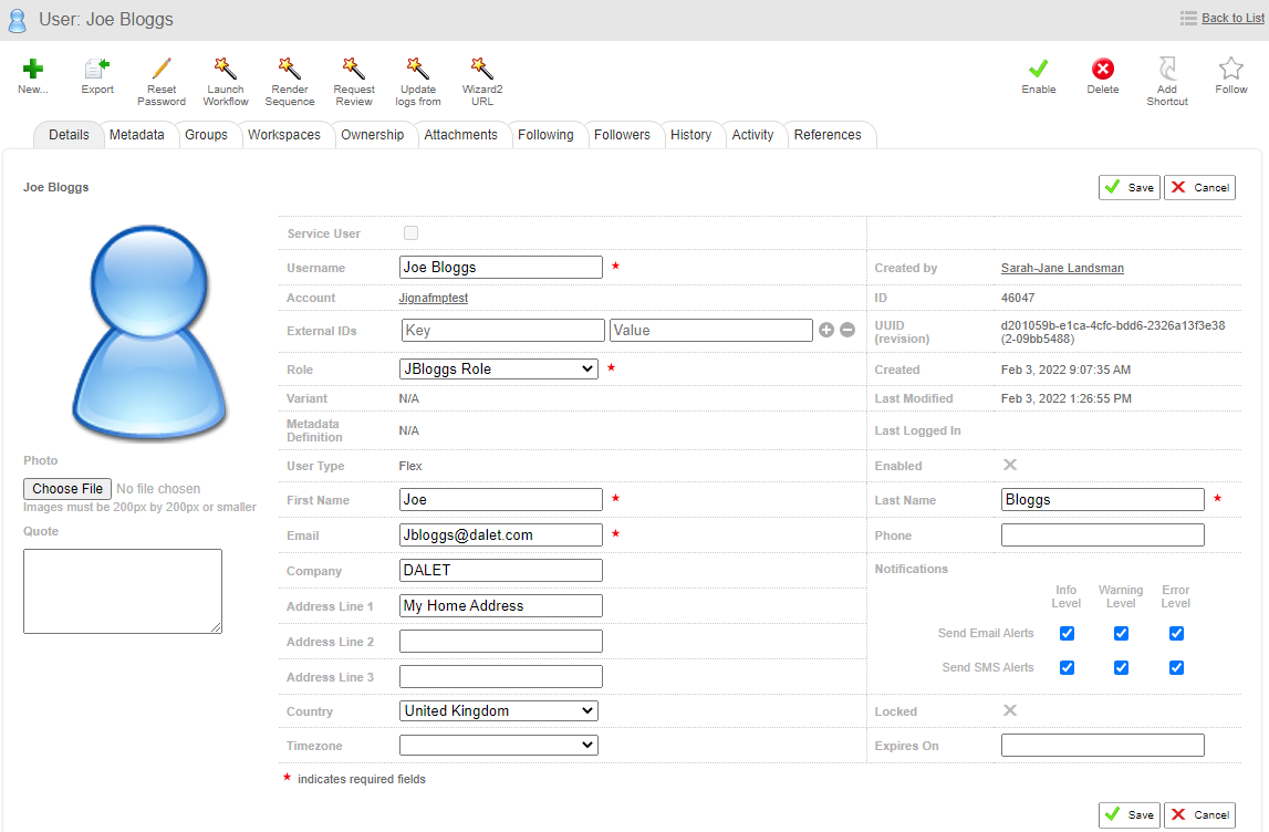 Role: Select a role for the user. Permissions are assigned to roles, so the role that the user has, will determine what they can see and do in Dalet Flex. Learn more about Roles and permissions here.