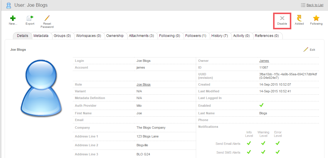 In the Users list, click on the user you wish to disable. This will take you to the user’s Details page.