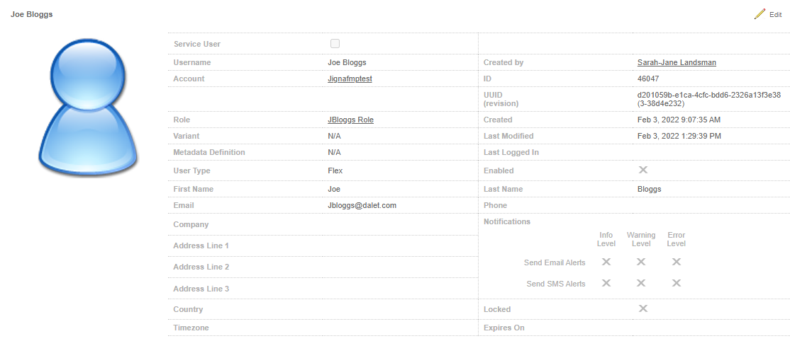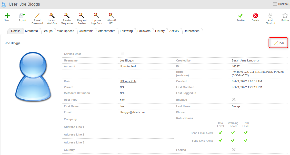 Once you have created the user, you can view and edit user information in the Details tab. You can also edit your own user details by clicking on your name in the top right corner and then clicking Edit when you are directed to the Details tab of your user account.