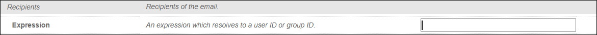 In the Expression field, you can enter an evaluated expression that resolves to a User/Group Id of the recipients of the message. You can enter multiple expressions by clicking the Plus icon. See the required syntax below.