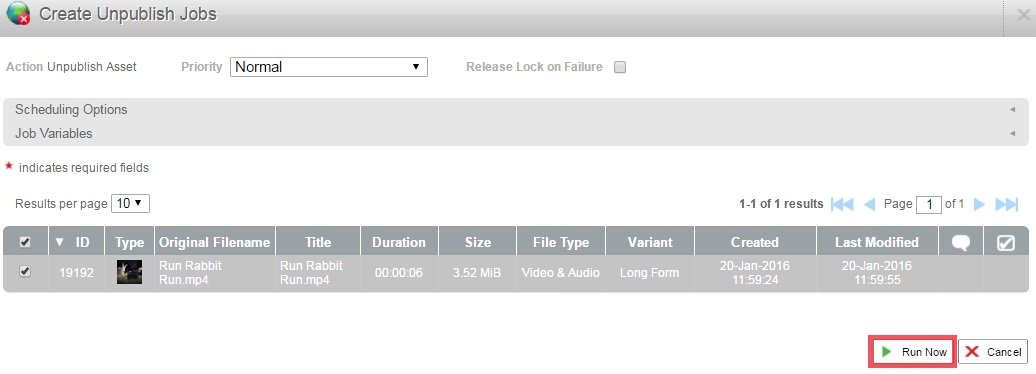 When the Create Un-publish Jobs pop-up appears, select the Un-publish action to use and fill in scheduling and configuration options. Click Run Now. The job is run.
