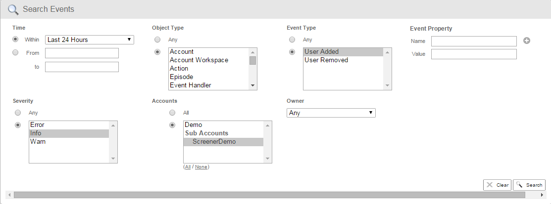 In the Search Events section, specify the criteria for the search.