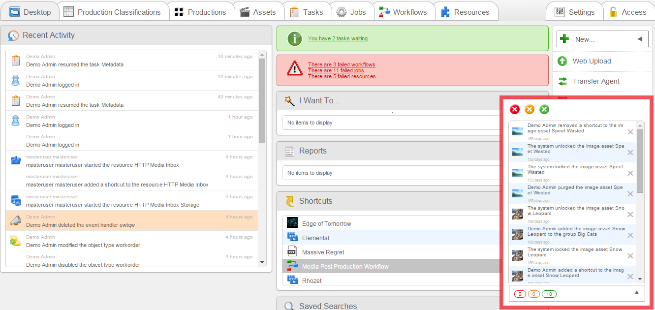 The notification box notifies you of events that have happened in Dalet Flex that are relevant to you. Events generated from objects you are following will appear in the notification box. The notification box auto-refreshes so you are always kept up to date with relevant events as they occur, without the need to manually refresh your browser.
