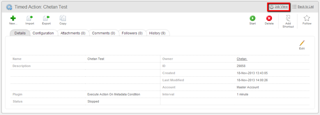 A timed action is a special type of action that is designed to be run at regular intervals. You will be aware by now that actions are run as jobs. In the case of a timed action, only one job exists and it is run every time the timed action interval has been exceeded. You can therefore link from a Timed Action screen to the related Timed Action Job Details screen in the Jobs section.
