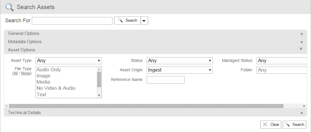 You may also see other fields which relate to each specific object type. For example, when looking at the Advanced Search screen in the Assets tab, you will also see search options for file formats and other asset-specific properties.