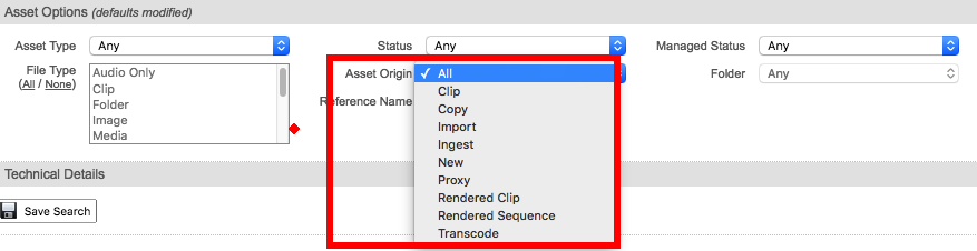 Click the Asset Origin drop down and select an asset origin, such as Clip, Copy, Import, Ingest, New, Proxy, Rendered Clip, Rendered Sequence, or Transcode.