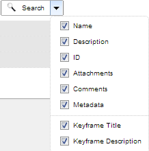 You can further refine which text-based aspects of an object you wish to search for. To do this, simply select or deselect the appropriate check box options in the drop down menu next to the Search For field in Advanced Search views. These check box options include Name, Description, ID, Attachments, and so on.