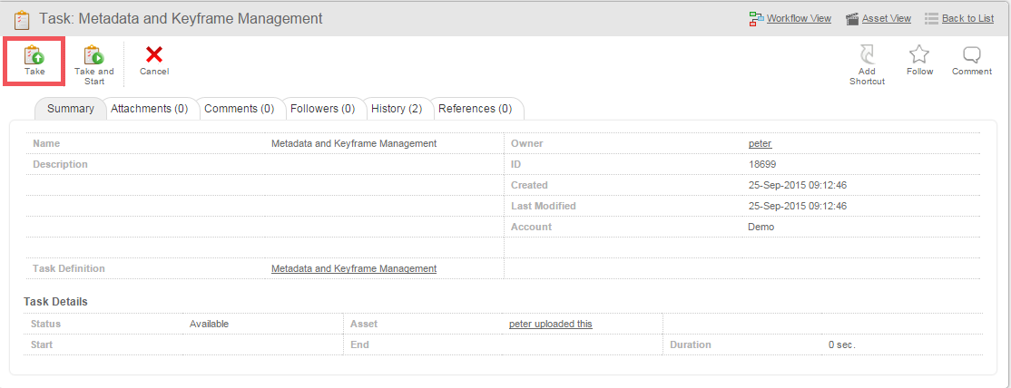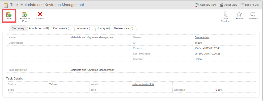 You can also view details about the asset or the workflow that created the task, by rolling over, or clicking on the Workflow View or Asset View links.