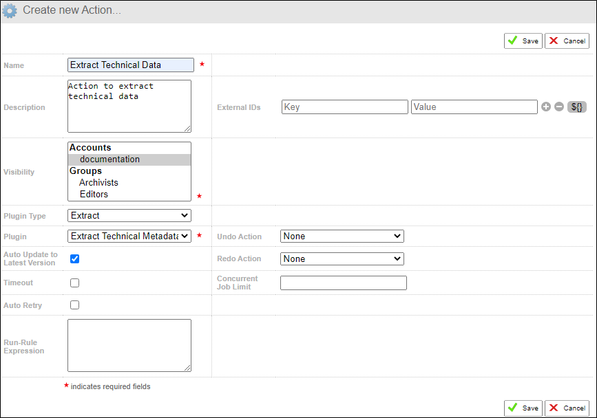 In the Create new Action screen, give your action a Name and an optional Description. Set which accounts and groups have access to the action by setting its Visibility and select the Extract Plugin Type and the Extract Technical Metadata Plugin.