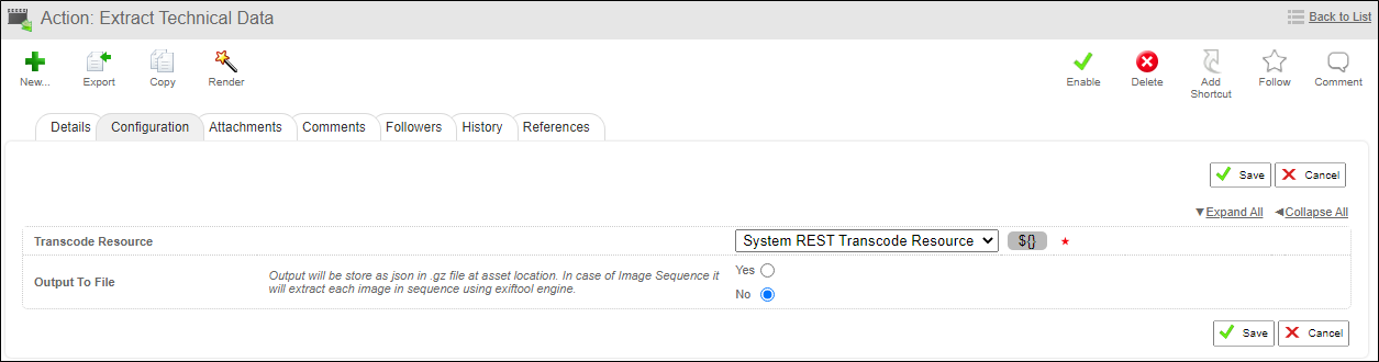 Save your changes and in the Configuration sub-tab, in the Transcode Resource field, select System REST Transcode Resource. Click Save and Enable your new action.