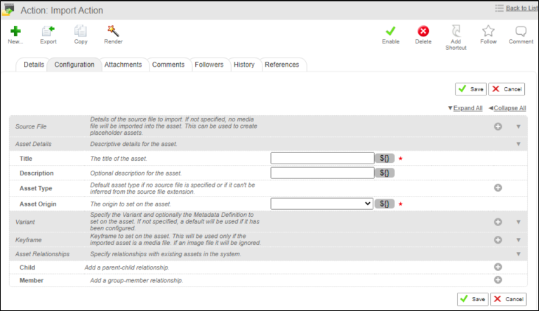 For an import action, you need to supply the location of the Source file being imported and the target storage location together with some additional metadata, such as the type (variant) of asset to create and which metadata schema to attach to the imported asset. You can use these instructions to create a simple import action that does not rely on additional scripts to supply variables to the workflow.