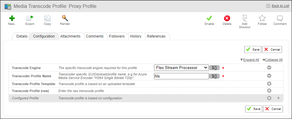 Save your changes and in the Configuration sub-tab, in the Transcode Engine field, select Flex Stream Processor.