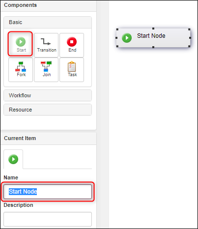 Every workflow must have a Start node, so begin by clicking on Start in the Basic group and then click on the canvas to add the Start node to the graph. If you want to change the name of the node, select it and edit the default text in the Name field in the Current Item section.