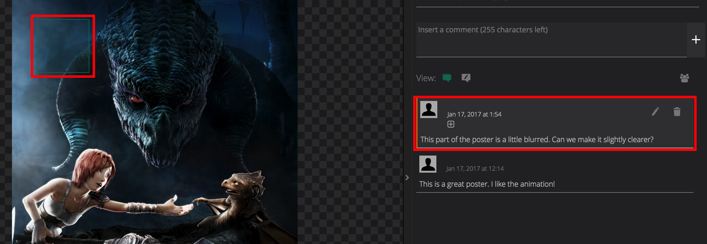 The comment is then posted against the selected area. If you click on a specific comment in the list, the area that the comment was made against will be highlighted.