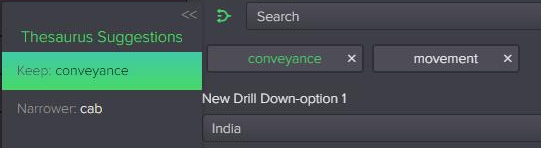 - You can also click on an existing tag to open the Thesaurus suggestion panel to choose a term to replace it. In this example, clicking on the conveyance tag displays the Thesaurus panel with suggestions.