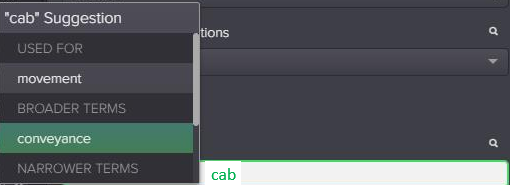 - In a regular Thesaurus field, type in the value you want to add and hit the space bar; a menu of matching terms sorted by relationship is displayed.