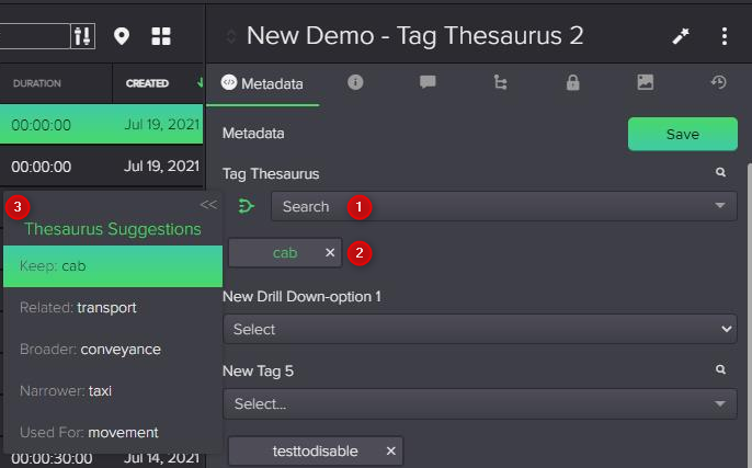 - Click the Thesaurus icon; a sliding Thesaurus panel appears on the left of the metadata panel containing a scrollable list of suggestions of related terms from the Thesaurus (3).