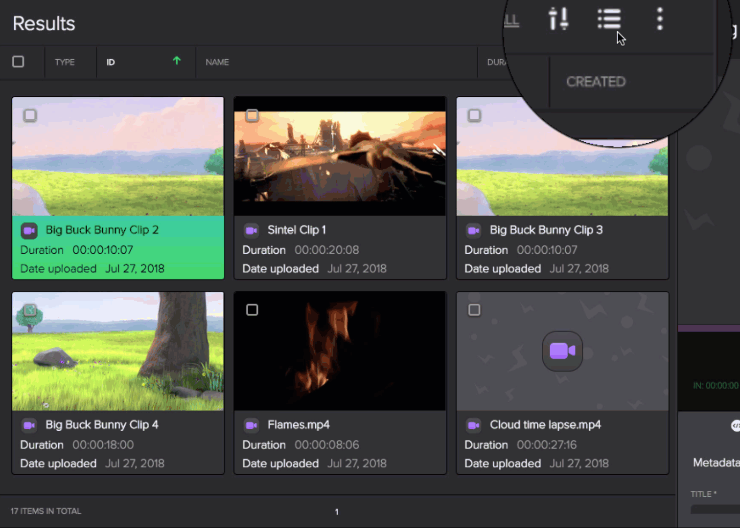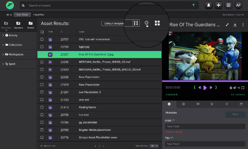 - In the tile view, you can see your asset thumbnails as well as the different metadata template for each asset type.