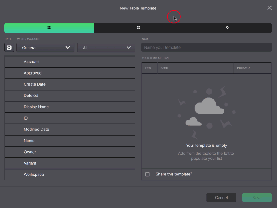 - In the New Template window, select whether you want to create a new template for List view, Tile view, or a template for viewing asset markers in the preview panel or manage page. Learn more about metadata markers here.