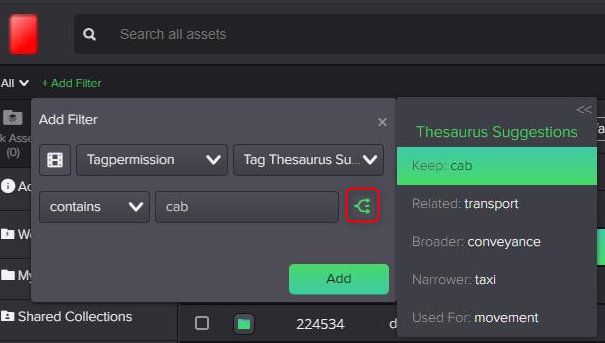 - A sliding Thesaurus panel will appear on the right of the Add Filter window, where you will see a scrollable list of thesaurus suggestions of related terms.