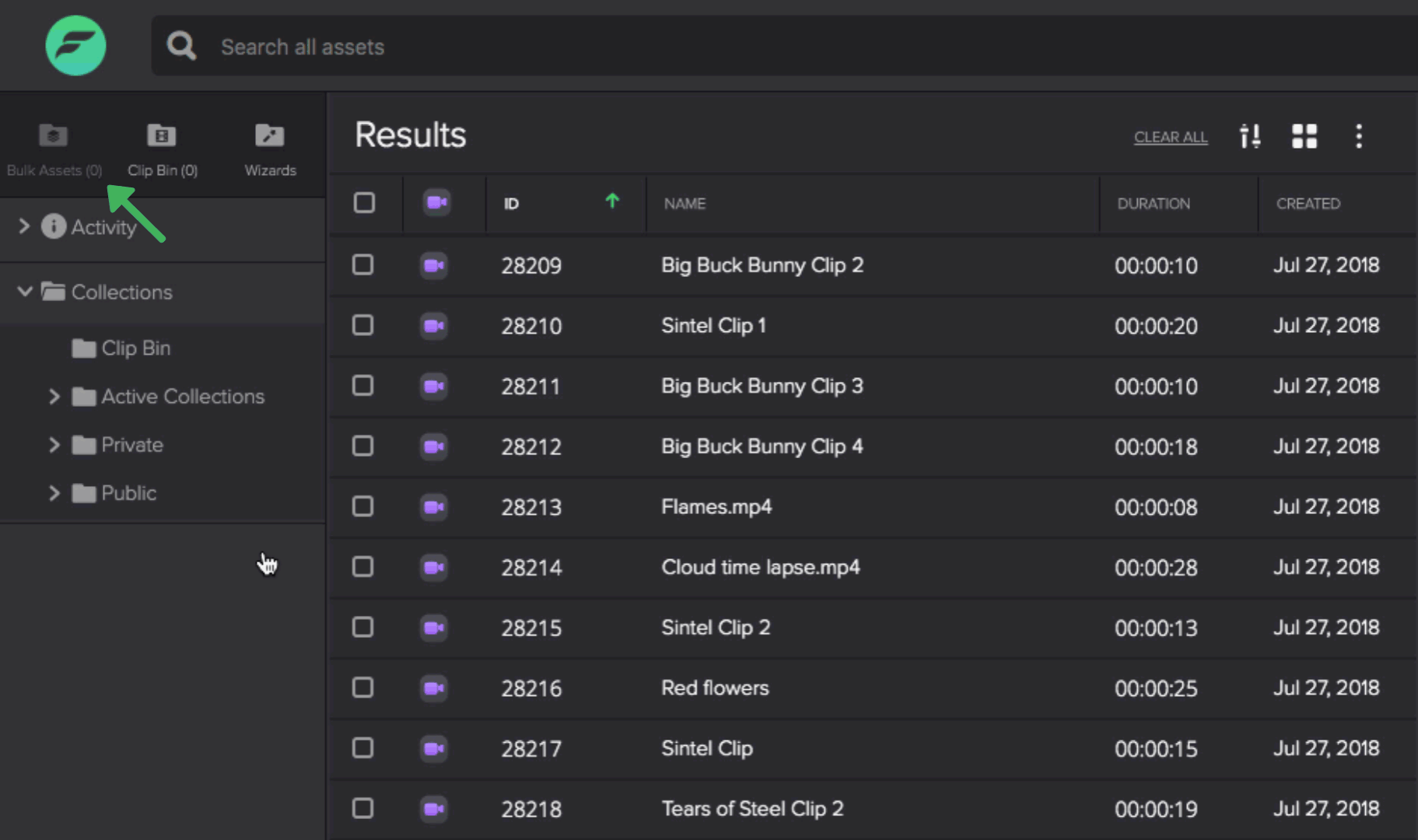 at the top right corner of the Bulk Assets list.