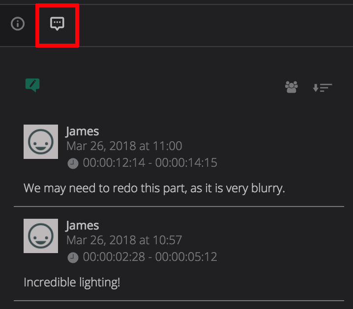 The Comments tab: This tab displays a list of comments that have been made against an asset. A number is displayed in the top-right corner of the Comments tab icon, which indicates how many comments have been made against the asset in total.