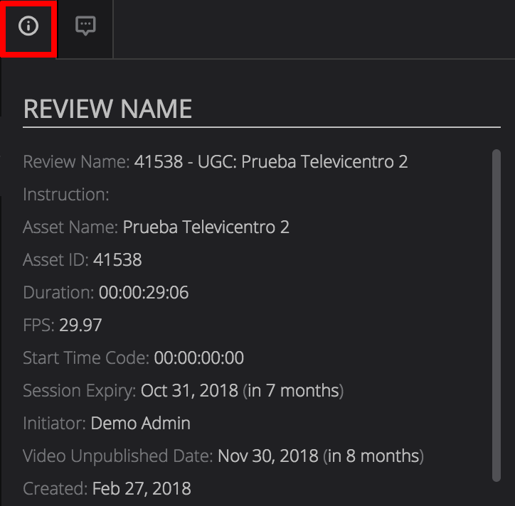 The Information tab: This tab displays various details about the review session, including the name of the review, any instructions that the creator of the reviewer has set, the duration of the asset, frame rate per second, the start time code, the initiator, and the session expiry date.