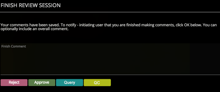 when you are done reviewing the asset. When you click this option, the Finish Review Session popup will appear. This allows you to select from a range of options to end the review, and then to leave a final overall comment against the review session.