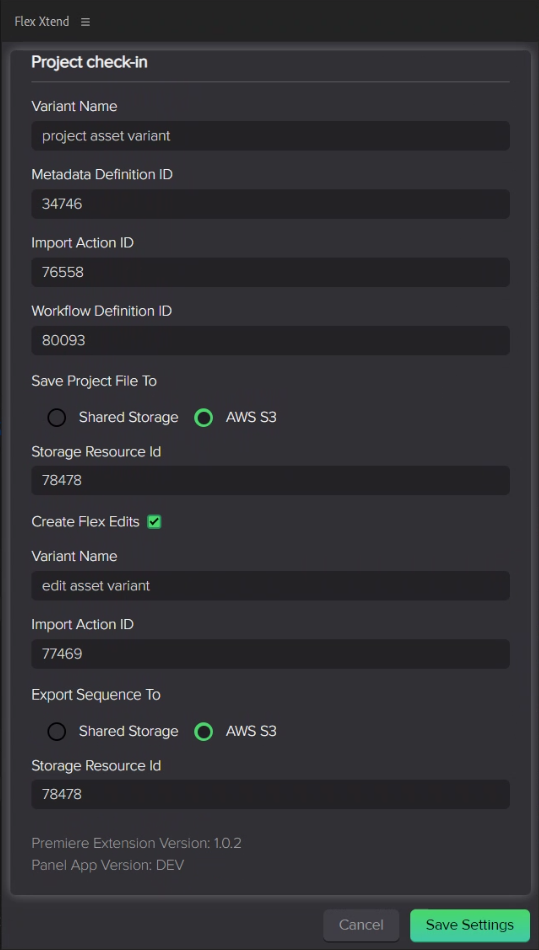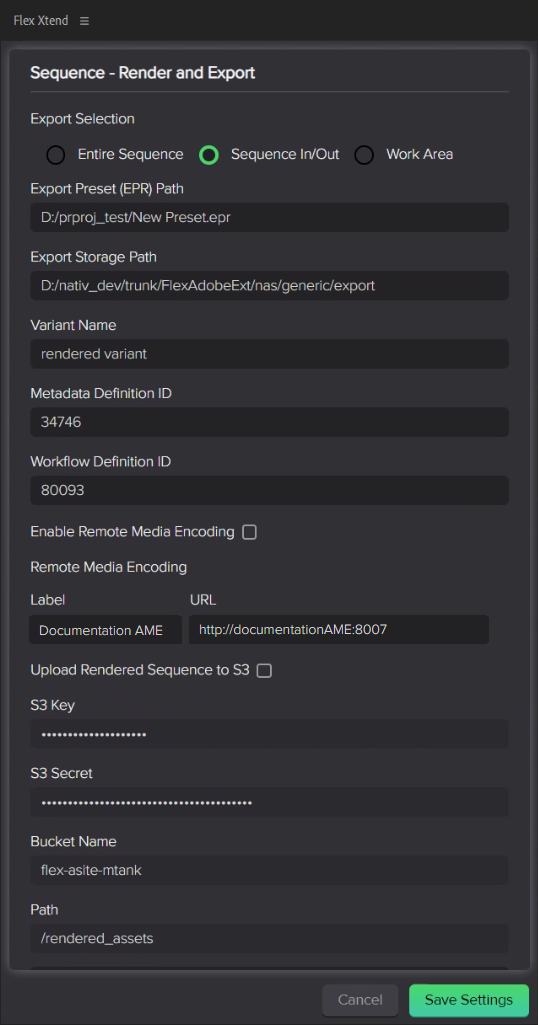 | Workflow Definition ID: | The workflow that the Flex Panel launches you render your sequence, creating a new asset (using Adobe Media Encoder). This workflow runs when you select Export > Export in the FlexXTEND panel. If no workflow ID is entered here, then no workflow will be triggered, and your project will be saved locally. |