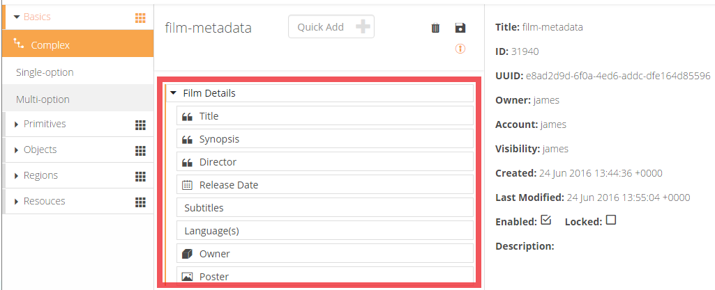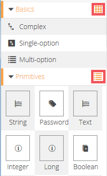 The Metadata panel is located on the left-hand side of the designer, and gives you access to the metadata field types to enable you to create your definition. The buttons available in this panel comprise all the types listed in the metadata field types section, grouped in the following way: