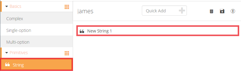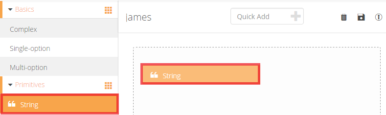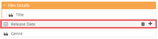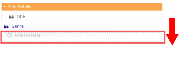 There are a number of ways to move fields on the canvas and change their position in relation to other fields. Before a field can be moved it must first be highlighted by clicking on it. Please note that at the current time, you can only move fields within the same container (Complex field). You cannot currently move them from one complex type to another.