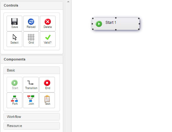 Select a node from the Components panel. Begin with a Start node, as every workflow must have exactly one Start node.