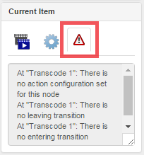 Once you have clicked on an invalid node, you can view the error under the Error tab, in the Current Item panel. In the example below, you can see that there is an error related to a transcode node.