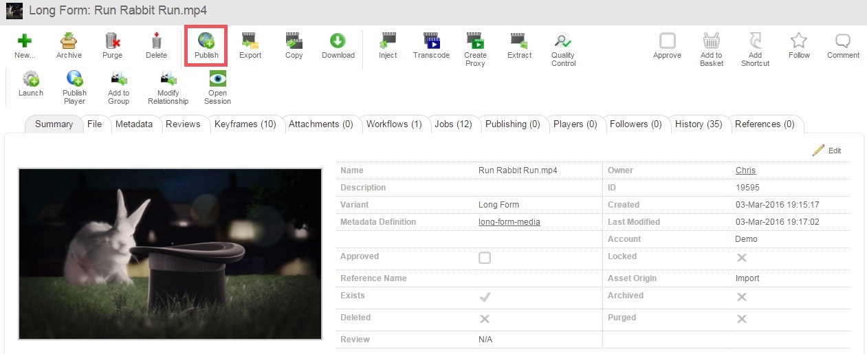 Click on the Publish action in the Asset toolbar in the Asset Details section for an asset.