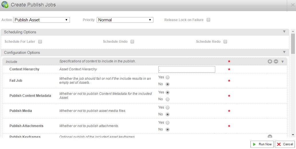 When the Create Un-publish Jobs pop-up appears, select the Un-publish action to use and fill in scheduling and configuration options. Click Run Now. The job is run.