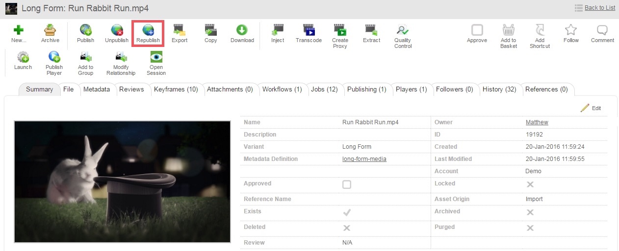 The following screens show the process of re-publishing an existing asset in Dalet Flex.