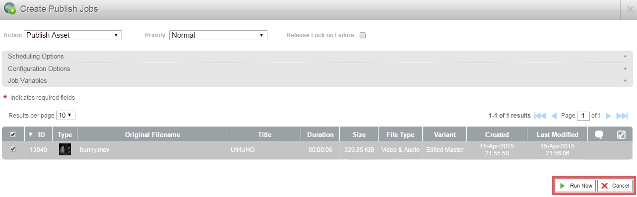 When the Create Republish Jobs Pop-up appears, click Run Job. The job is run and the asset is re-published.