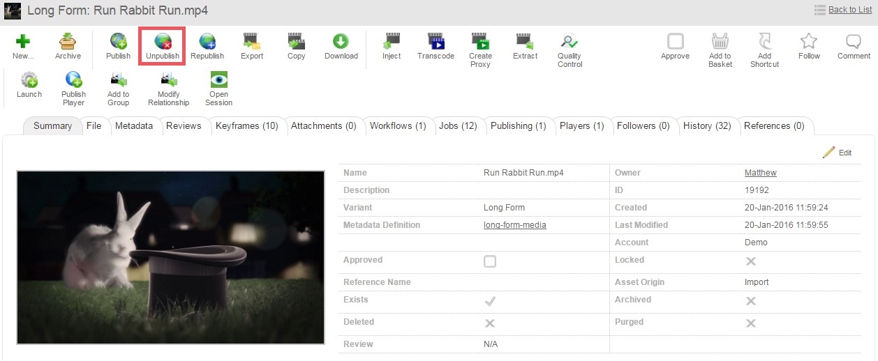 The following screens show the process of Un-Publishing an asset in Dalet Flex.