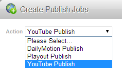 In the Create Publish Jobs box, select the Publish Action type, for example YouTube Publish.