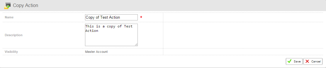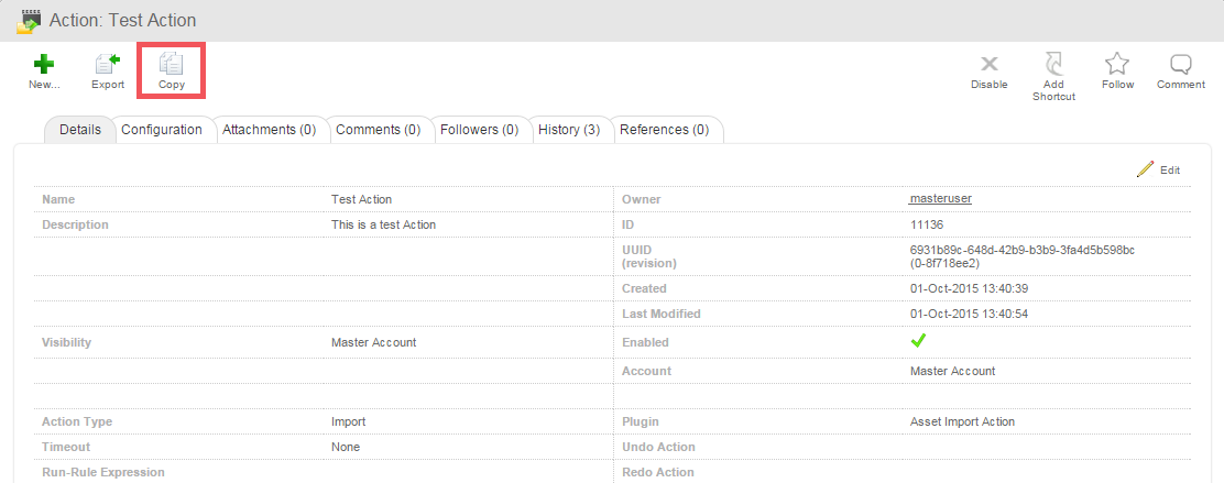 To copy an object, navigate to the Object Details section of the object you wish to copy, for example an action.
