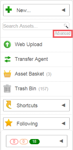 You may also see other fields which relate to each specific object type. For example, when looking at the Advanced Search screen in the Assets tab, you will also see search options for file formats and other asset-specific properties.
