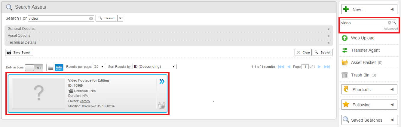 You may choose to combine field-based and text base searches. For example, in the asset dashboard, you can search for all assets that are owned by Joe Blogs that have a creation date of 19/10/2015 and comprise text matching the fuzzy term roam~.