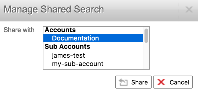 You can share a saved search with an account, sub-account, or workspace. If you share a search with an account, sub-account, or workspace, that search will be shared with all the users who have access to those.
