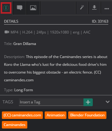 The Details tab: Displays specific details of that selected asset such as the title, description, creation date, the asset type, and whether or not the asset has been published. You can also view tags that have been applied to this asset, as well as add new ones.