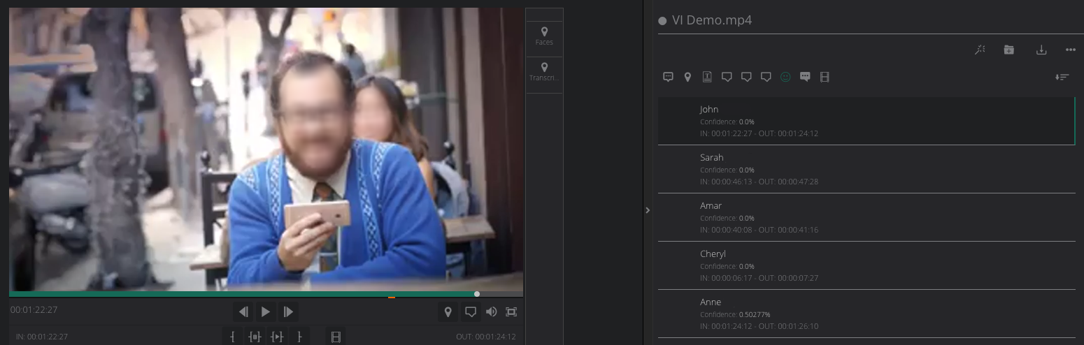 Here you can see various tracks listed below the player such as Sentiments, Transcripts, Audio Effects, and Faces.