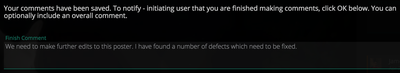 when you are done reviewing the asset. When you click this option, the Finish Review Session popup will appear. This allows you to select from a range of options to end the review, and then to leave a final overall comment against the review session.